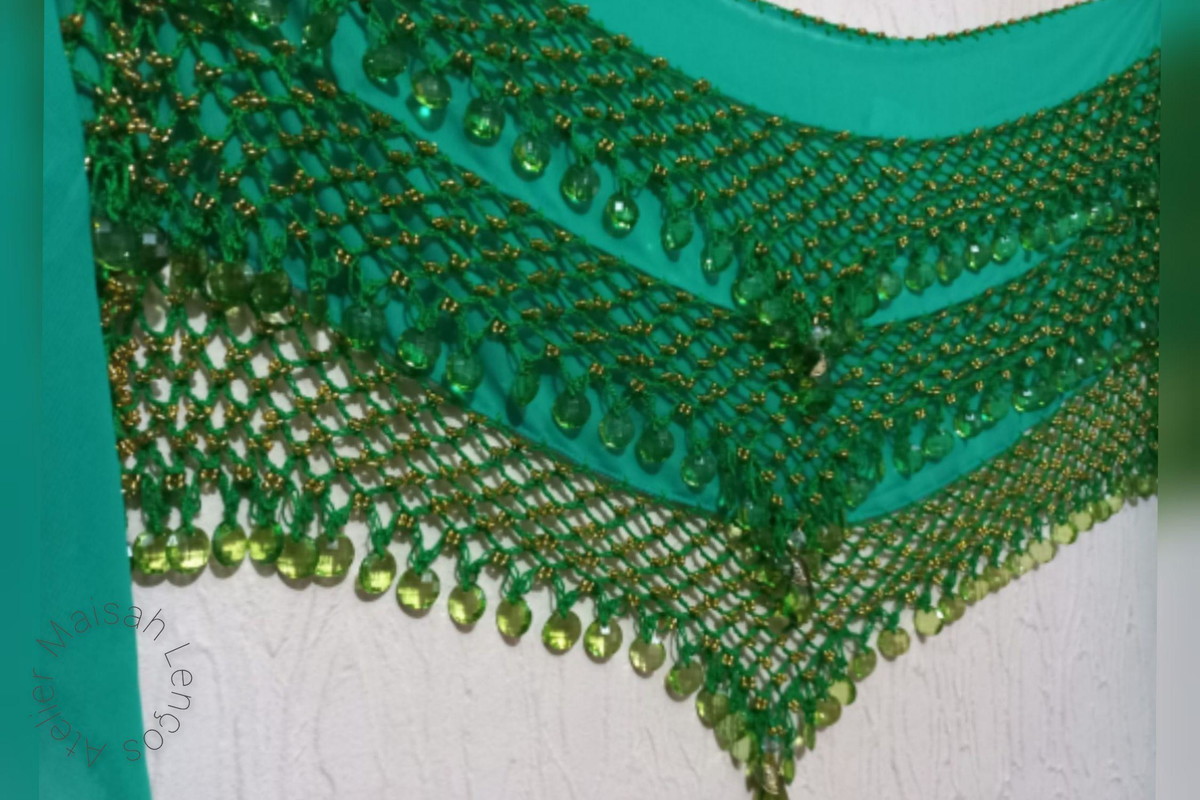 100% poliéster/ Pedrarias douradas/ Artesanal